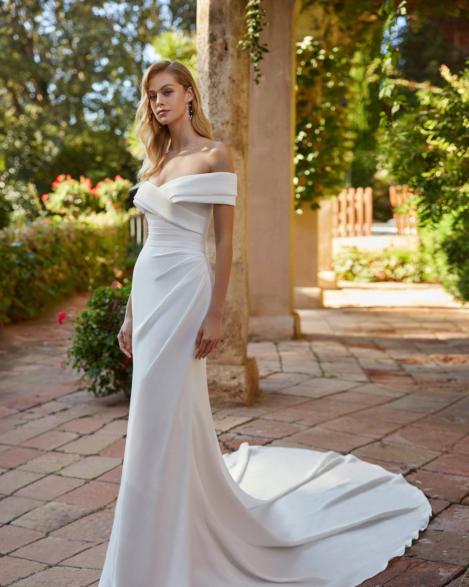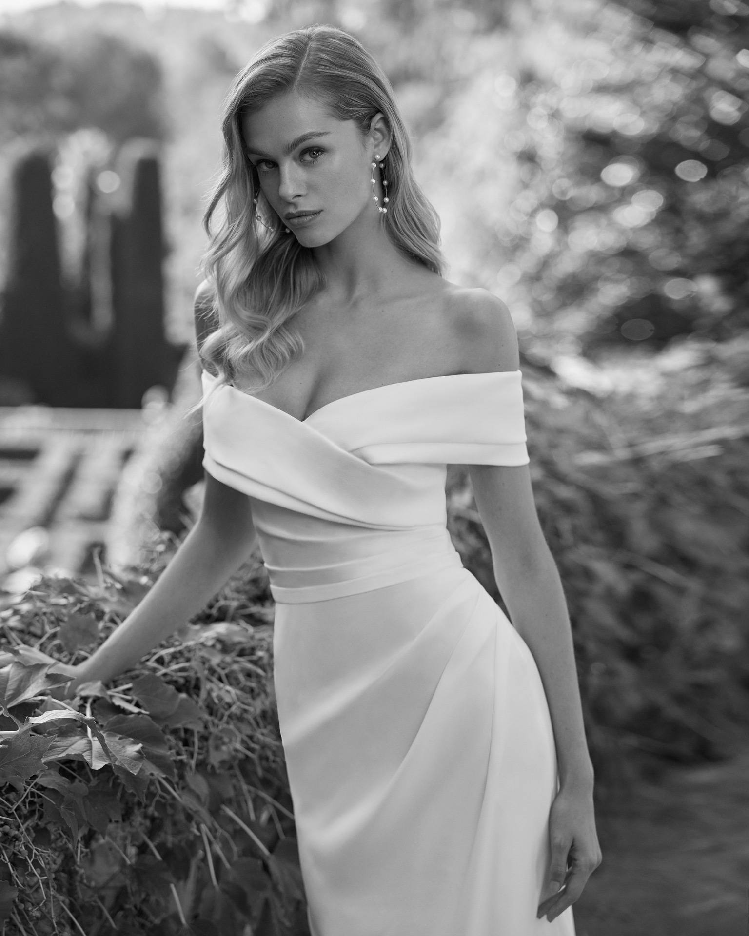 Vestido de novia minimalista con carácter y elegancia. El modelo Dariel, confeccionado en un suave crepé de alta calidad, destaca por su escote off-shoulder que realza los hombros y aporta un aire romántico y sofisticado.