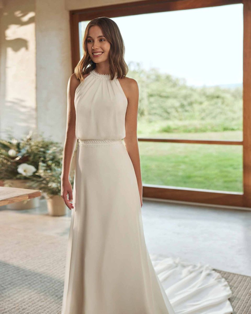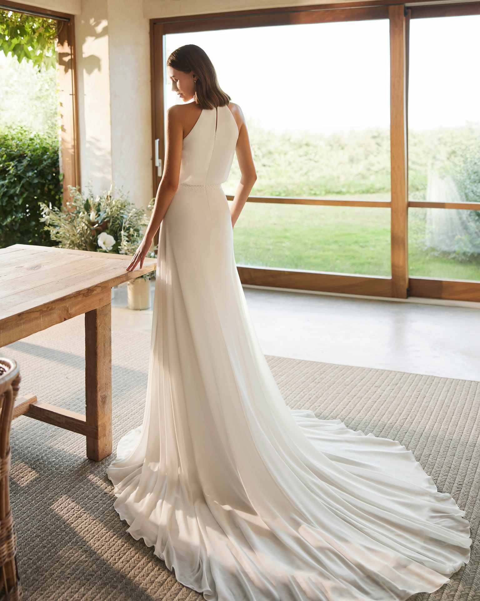 Vestido de novia Nagui de Luna Novia. Un diseño minimalista en crepé liso con corte recto y falda fluida, acompañado de una cola larga elegante que aporta movimiento. Su escote halter fruncido realza el cuello con sofisticación, mientras que la capa ligera que cae desde los hombros añade un aire majestuoso y contemporáneo.