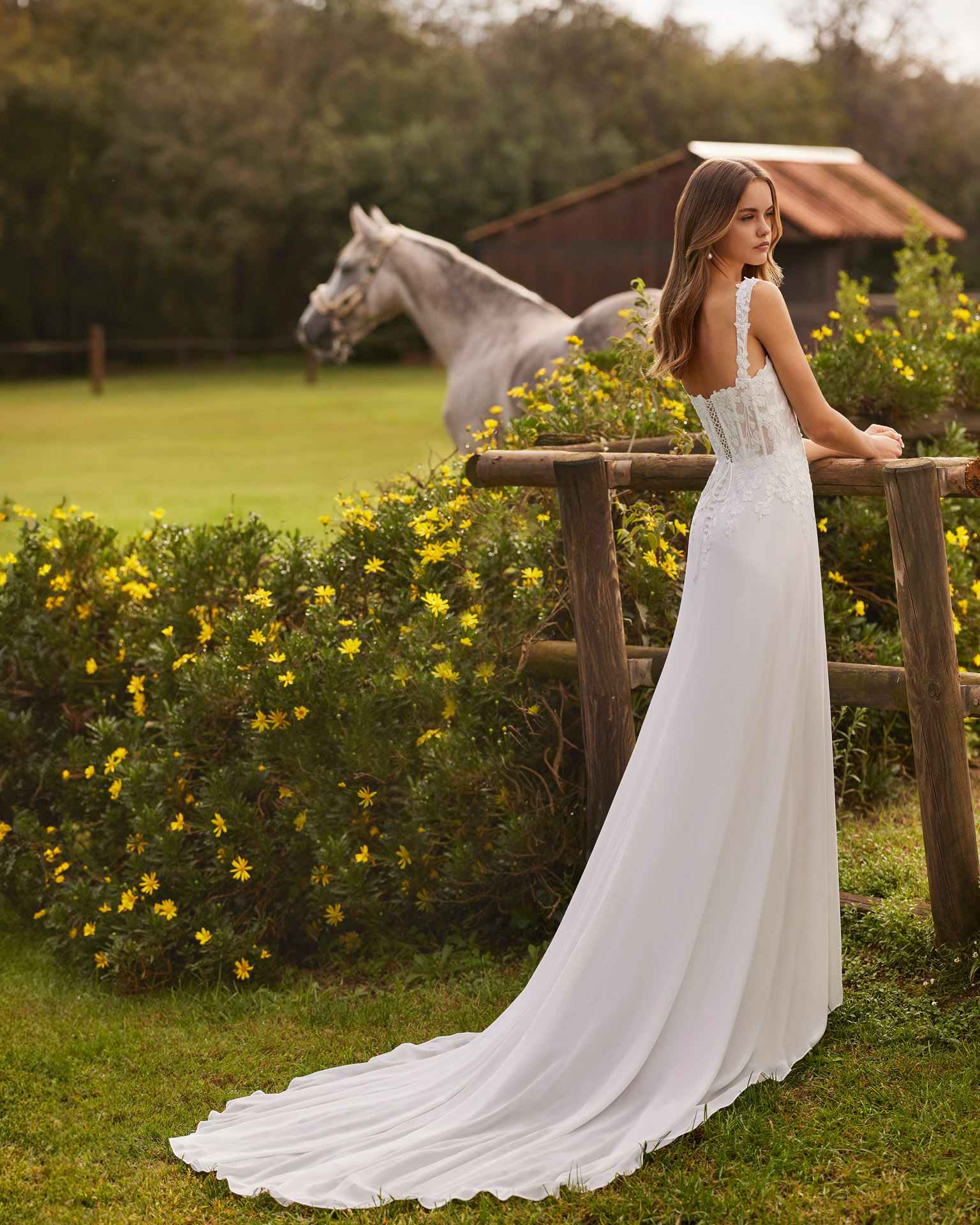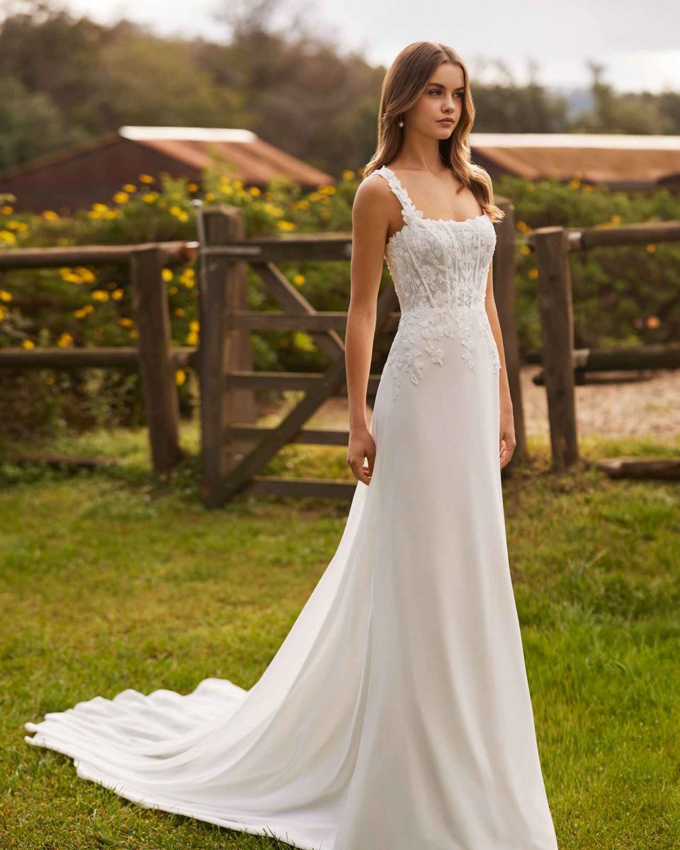Vestido de novia Nelsia de Luna Novia. Un diseño elegante en crepé con corte recto y cola fluida, que estiliza la figura con sencillez y sofisticación. El cuerpo de encaje con transparencias y los tirantes bordados aportan un aire romántico, mientras que la espalda escotada en pico realza la feminidad con delicadeza.