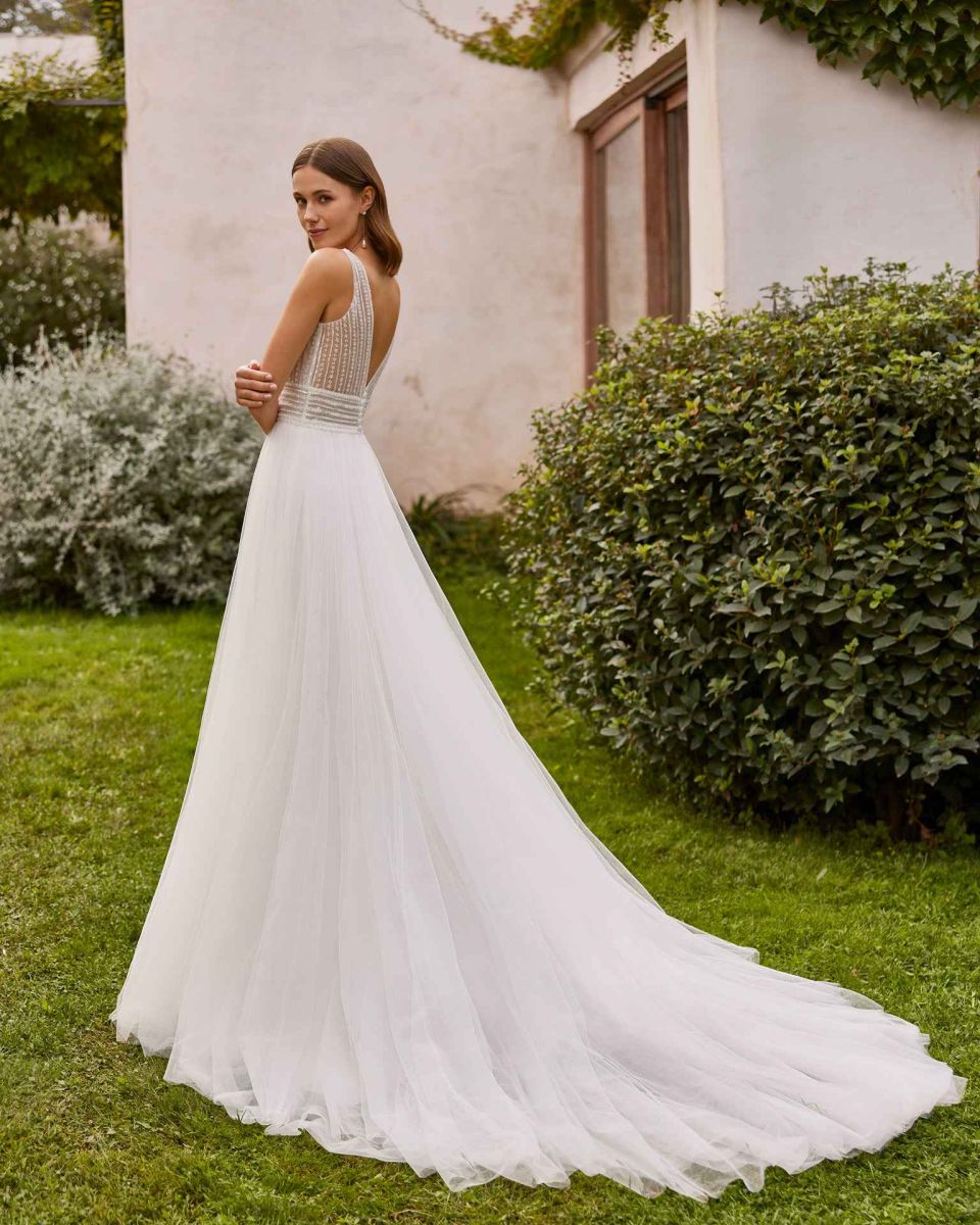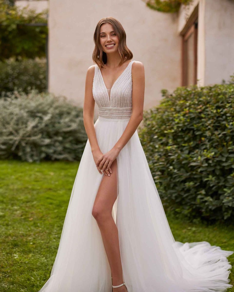 Vestido de novia Numat de Luna Novia. Un diseño ligero en tul con falda vaporosa y cola larga, perfecto para un look romántico y femenino. El cuerpo bordado con pedrería y escote en V realza la silueta con elegancia, mientras que la abertura lateral en la falda aporta frescura y un toque moderno.