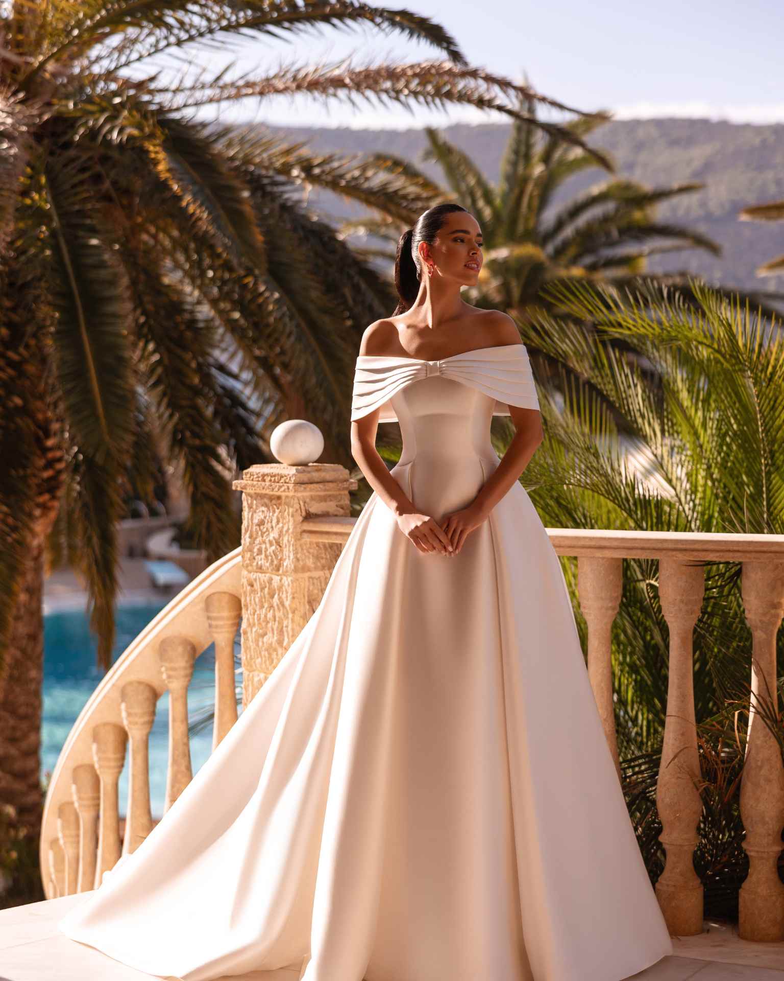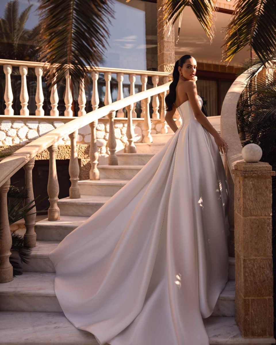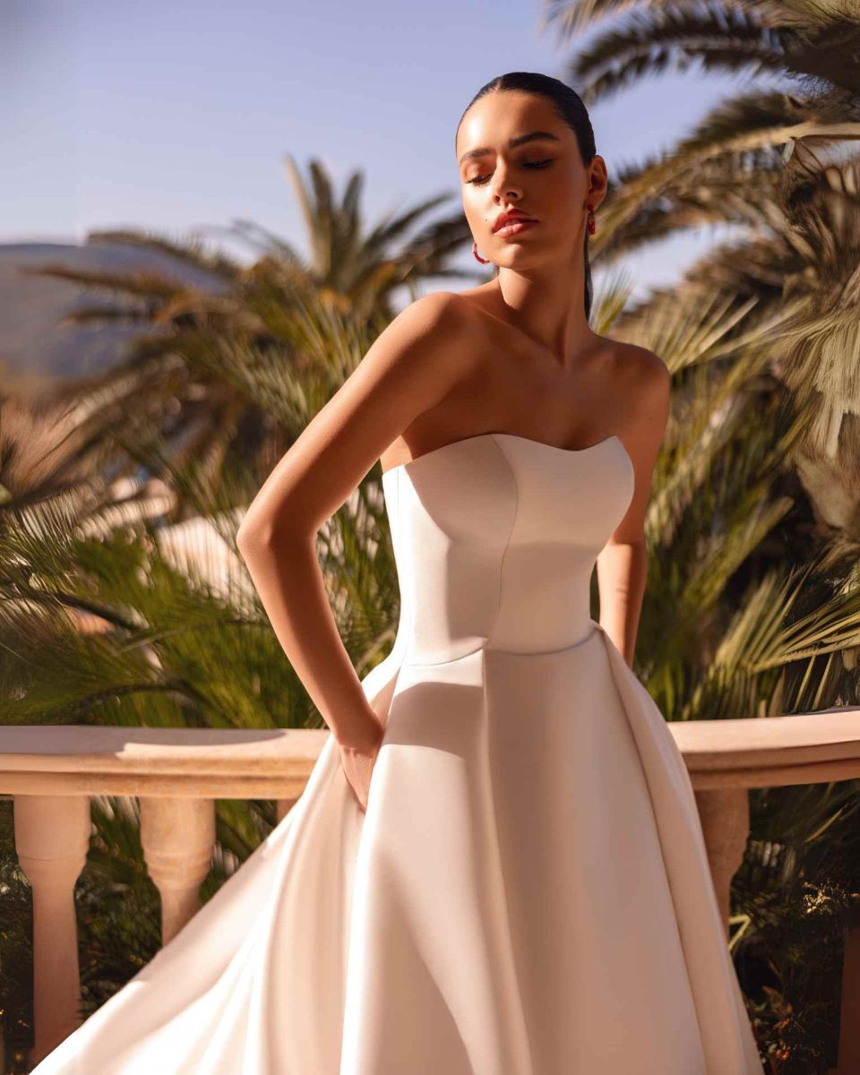 El vestido de novia Cosmobella 8251 de Demetrios es un diseño clásico y elegante confeccionado en mikado de alta calidad. Su escote palabra de honor estructurado y la opción de manga caída lo convierten en una pieza versátil y sofisticada. La falda amplia con cola realza la figura y aporta un aire majestuoso, ideal para novias que buscan un estilo atemporal y refinado.