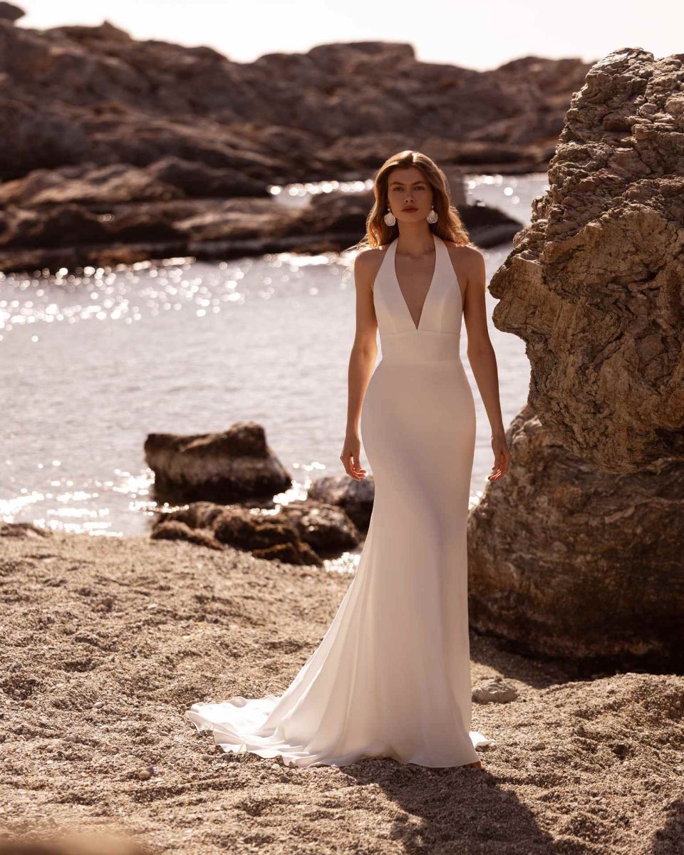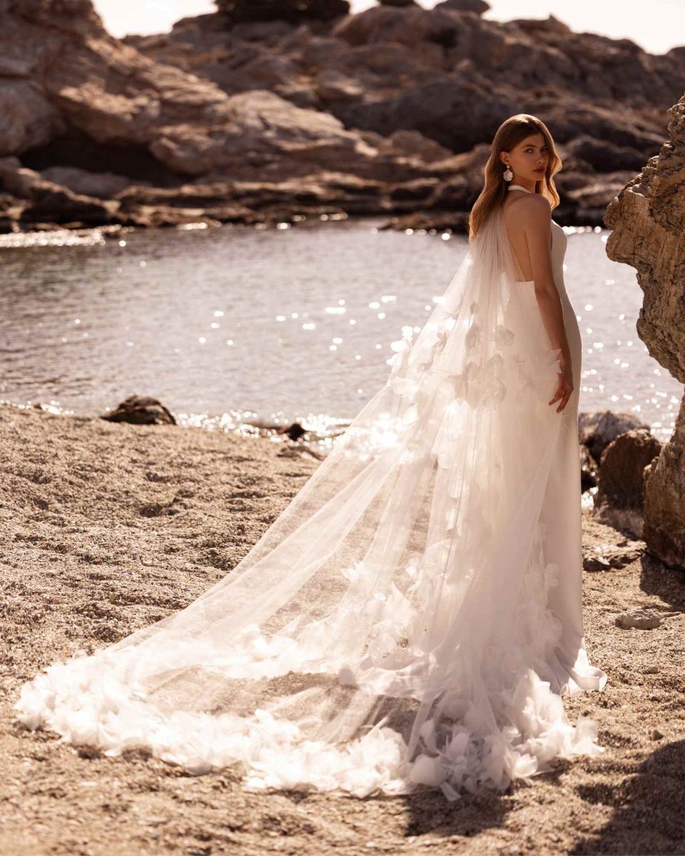 El vestido de novia Demetrios Destination Romance DR424 es un diseño minimalista y sofisticado que realza la silueta femenina con un corte sirena elegante. Su profundo escote en V y espalda descubierta aportan un toque sensual, mientras que la cola ligera con velo floral desprende romanticismo y frescura, ideal para bodas al aire libre o en la playa.