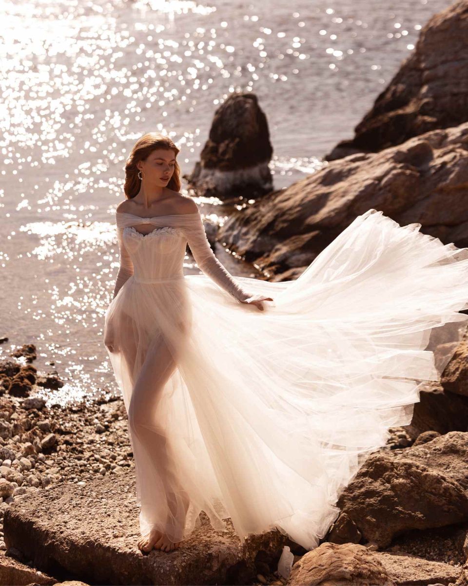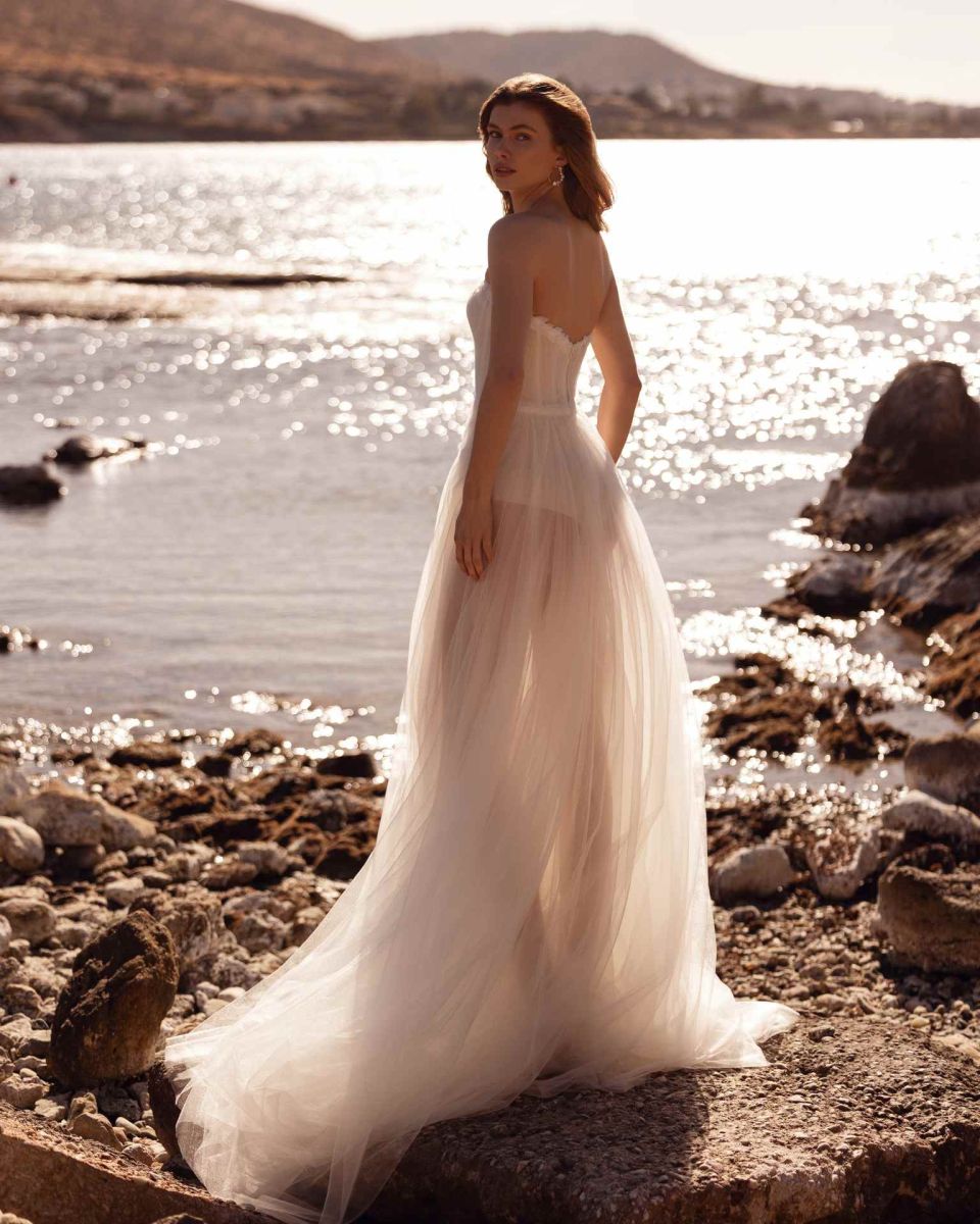 El vestido de novia Demetrios Destination Romance DR432 destaca por su romanticismo etéreo con un diseño de tul ligero y movimiento delicado. Su escote palabra de honor con mangas caídas añade sensualidad y elegancia, mientras que la falda vaporosa crea una silueta soñada, ideal para novias que buscan un look natural y sofisticado frente al mar.