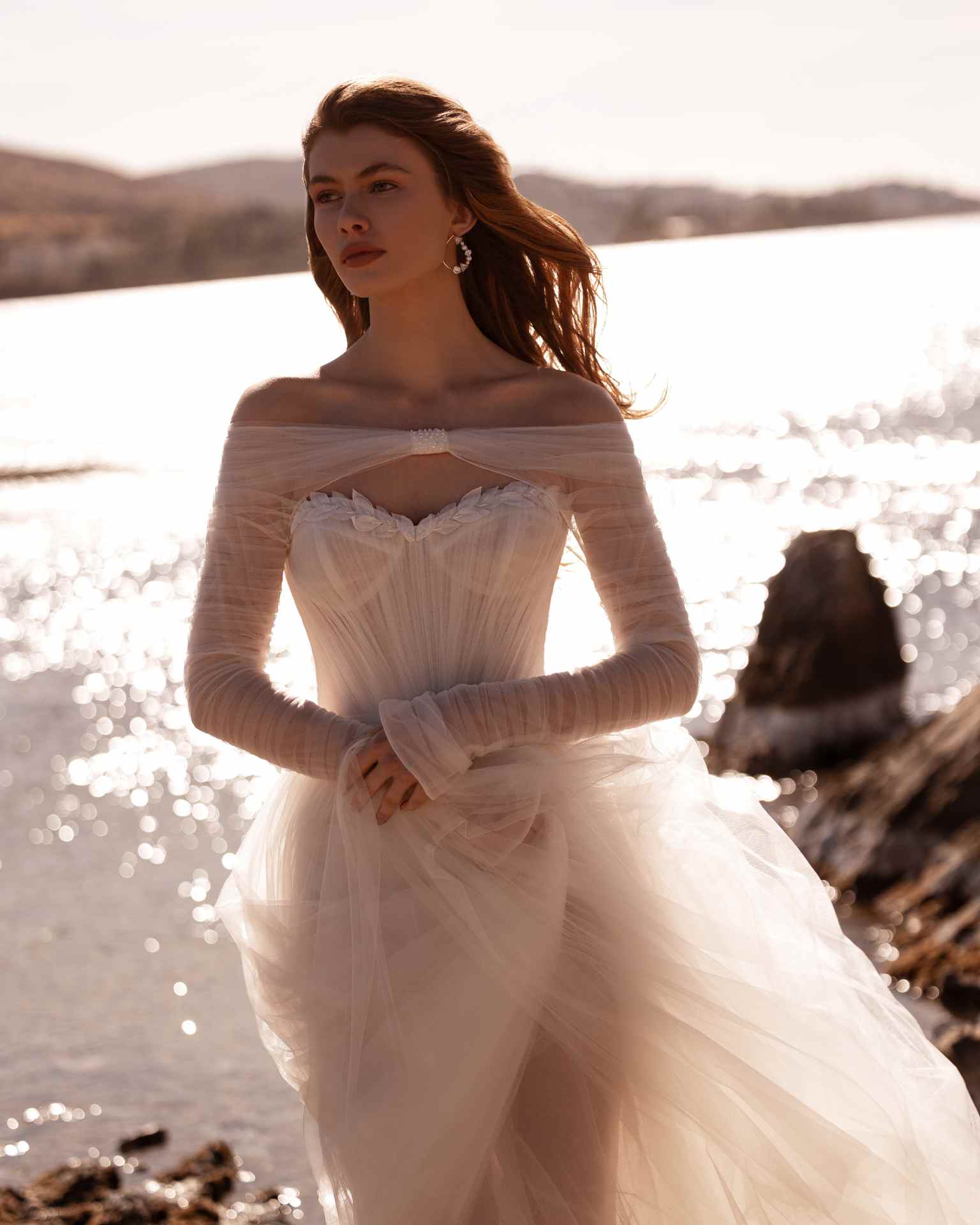 El vestido de novia Demetrios Destination Romance DR432 destaca por su romanticismo etéreo con un diseño de tul ligero y movimiento delicado. Su escote palabra de honor con mangas caídas añade sensualidad y elegancia, mientras que la falda vaporosa crea una silueta soñada, ideal para novias que buscan un look natural y sofisticado frente al mar.