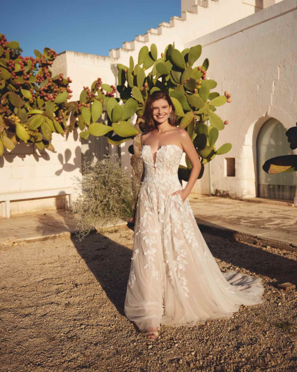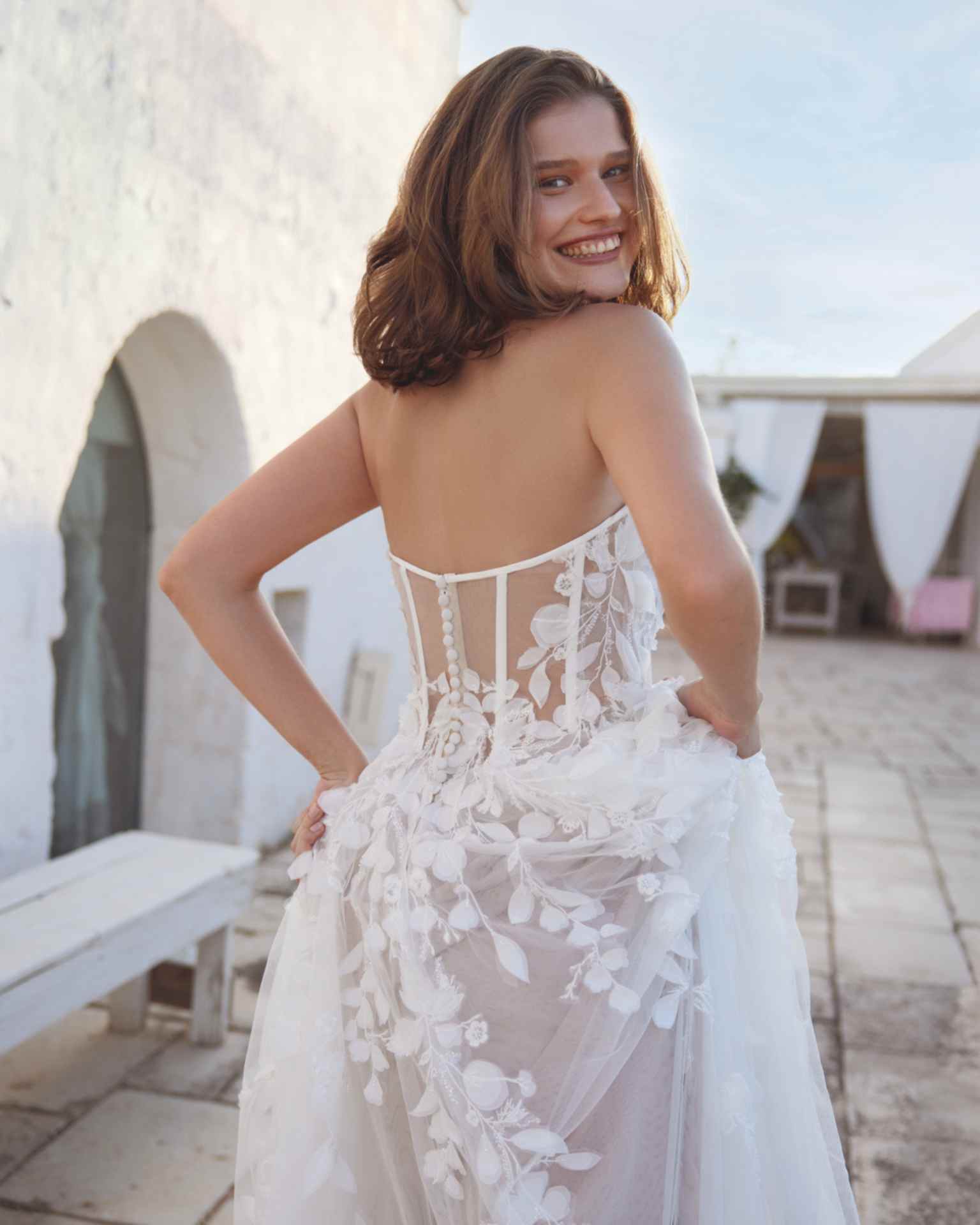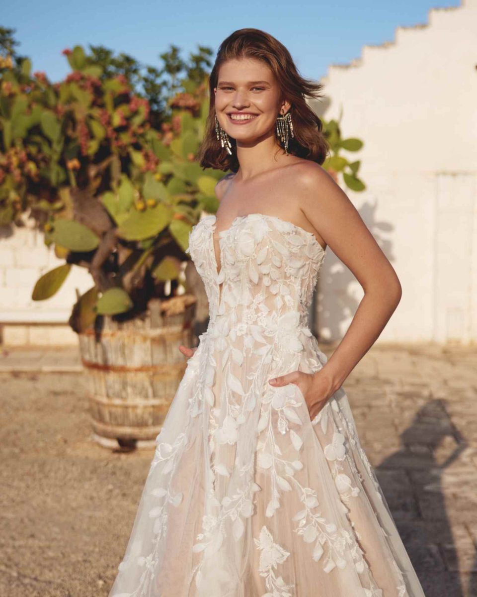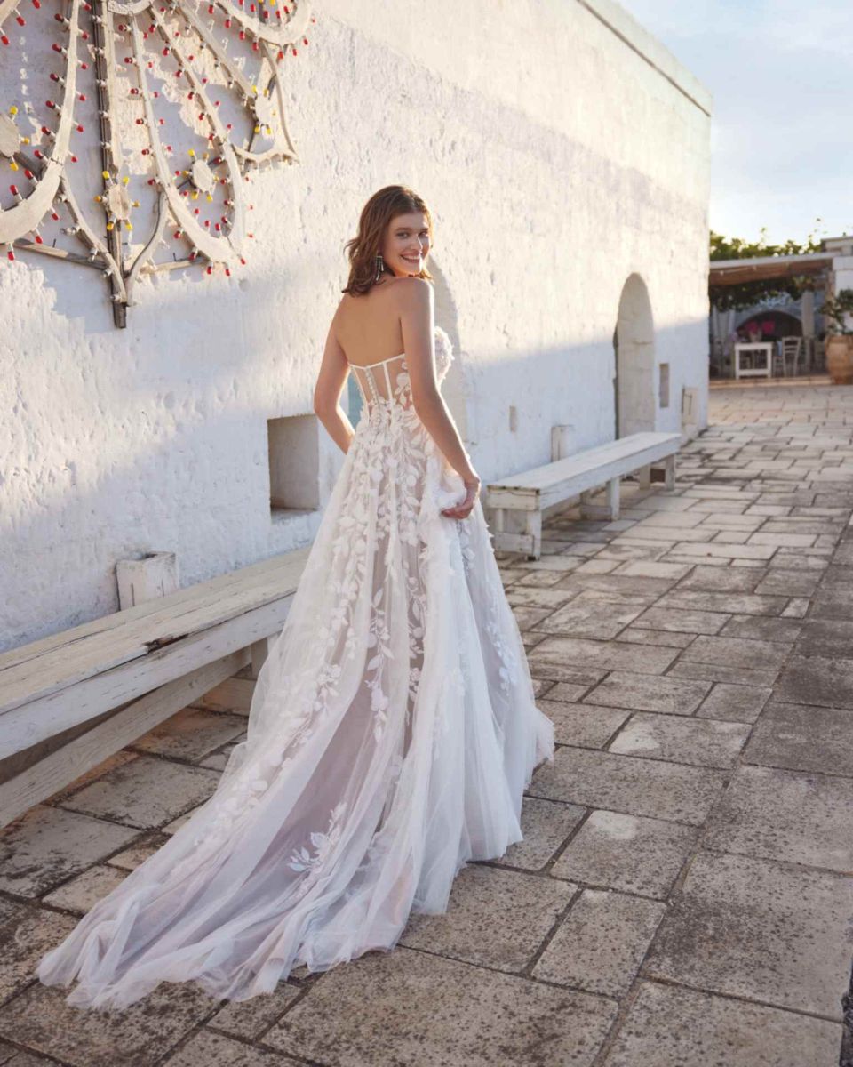 El vestido de novia Lillian West by Justin Alexander destaca por su espíritu boho romántico con aplicaciones florales en relieve, transparencias sutiles y un corte ligero que realza la silueta con naturalidad. Un diseño fresco y etéreo, perfecto para novias que buscan comodidad sin perder elegancia.