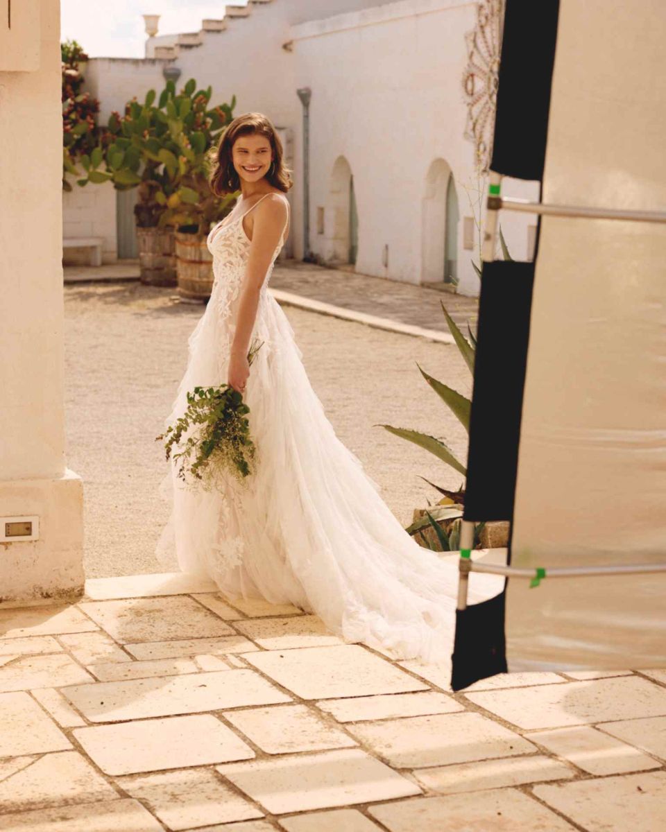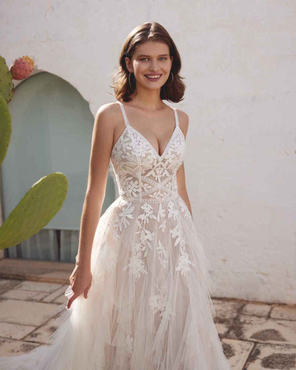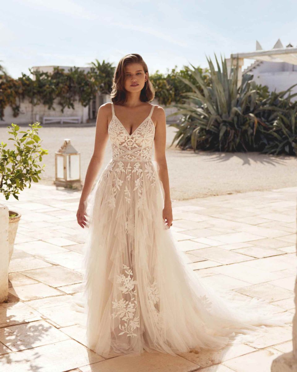 El vestido de novia Lillian West by Justin Alexander destaca por su espíritu boho romántico con aplicaciones florales en relieve, transparencias sutiles y un corte ligero que realza la silueta con naturalidad. Un diseño fresco y etéreo, perfecto para novias que buscan comodidad sin perder elegancia.