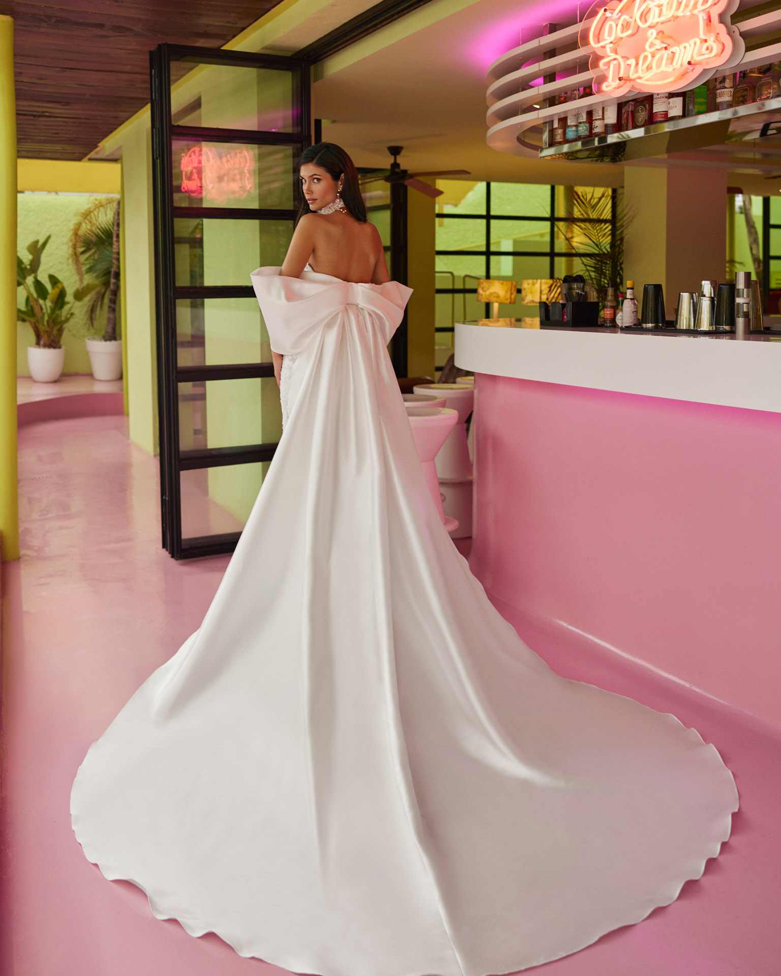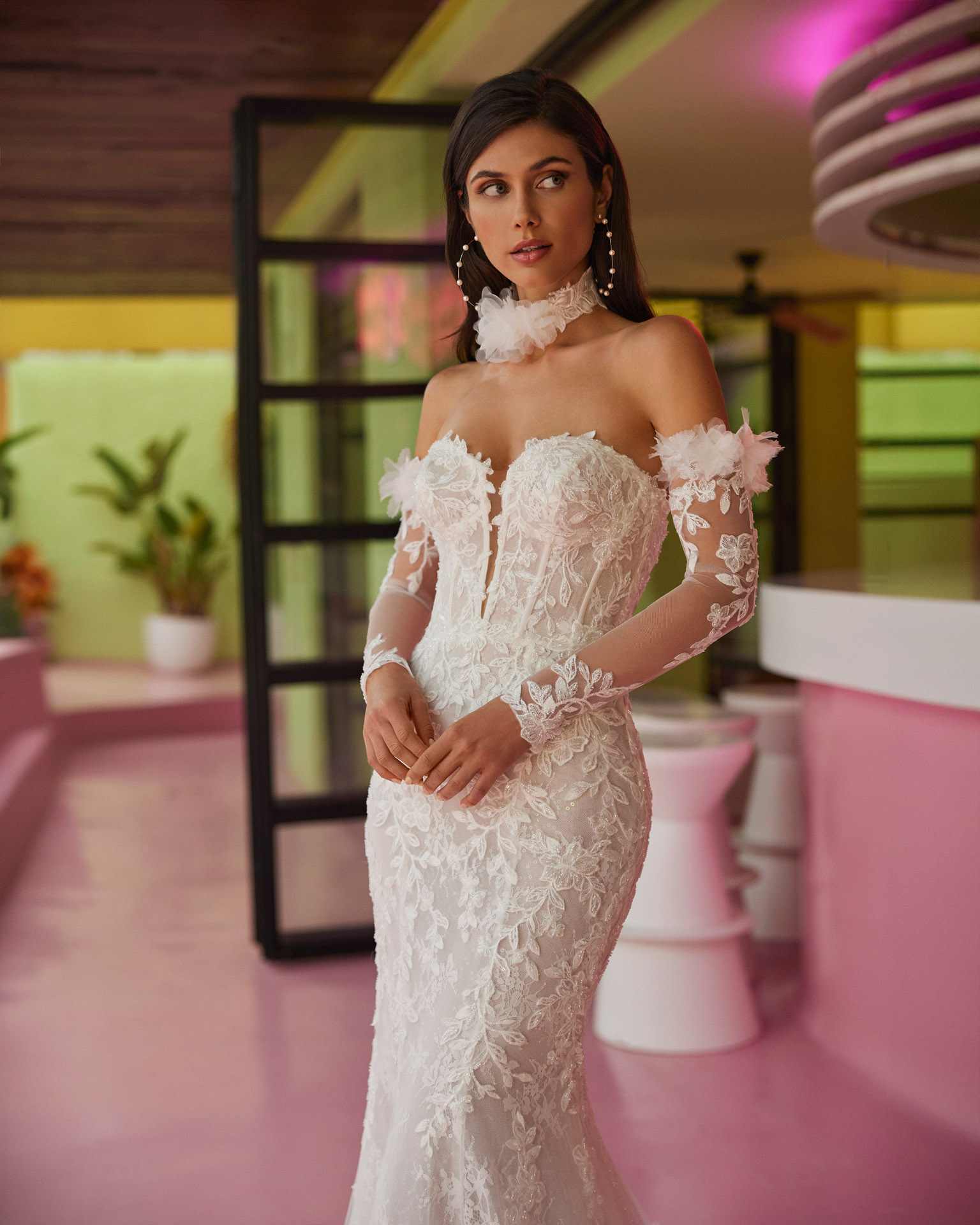 Vestido de novia Luna Novia corte sirena. Con escote palabra de honor en encaje bordado, mangas caídas opcionales y un ajuste que realza la silueta, este diseño fusiona sensualidad y romanticismo. La cola larga con sobrefalda desmontable aporta majestuosidad, creando un look versátil y elegante para el gran día.