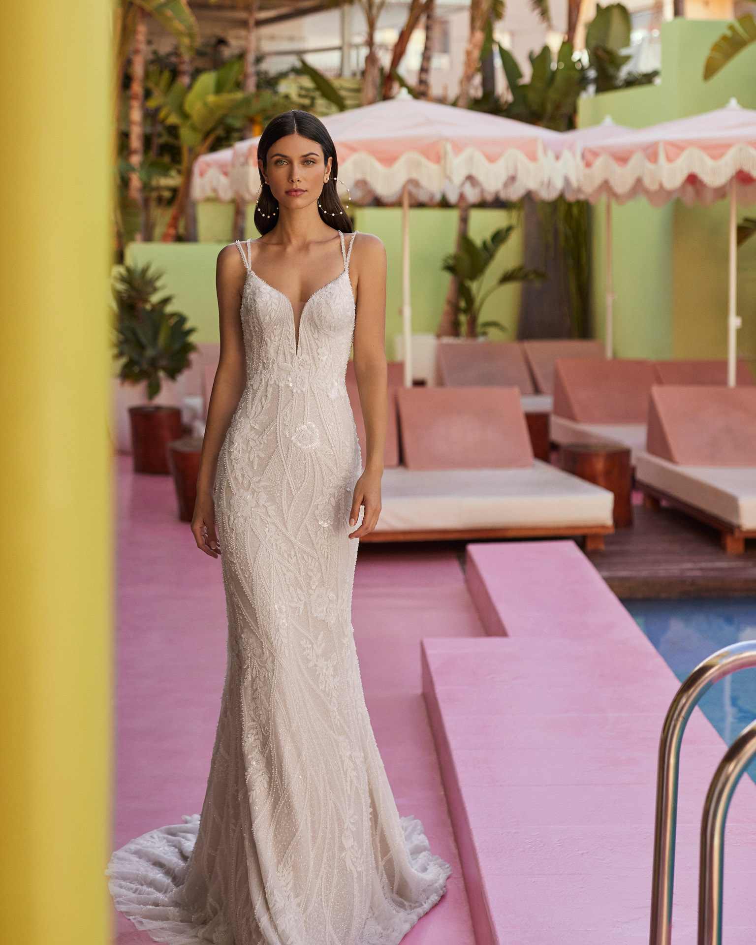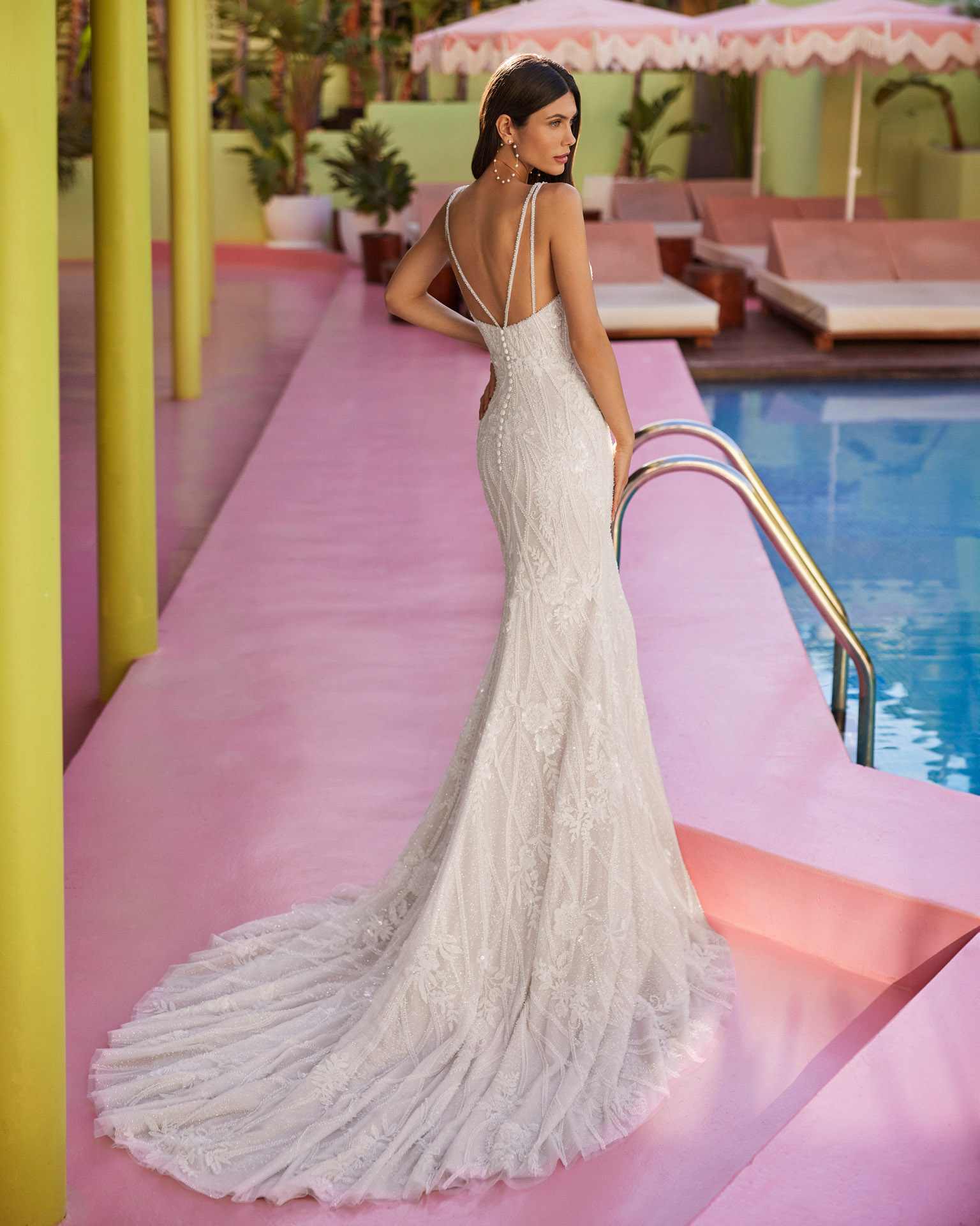 Vestido de novia Luna Novia corte sirena. Con escote en V profundo y finos tirantes, este diseño de encaje bordado realza la silueta con sofisticación. La espalda abierta con delicados tirantes cruzados y la cola fluida aportan sensualidad y ligereza, perfecto para novias que buscan un look moderno y elegante.