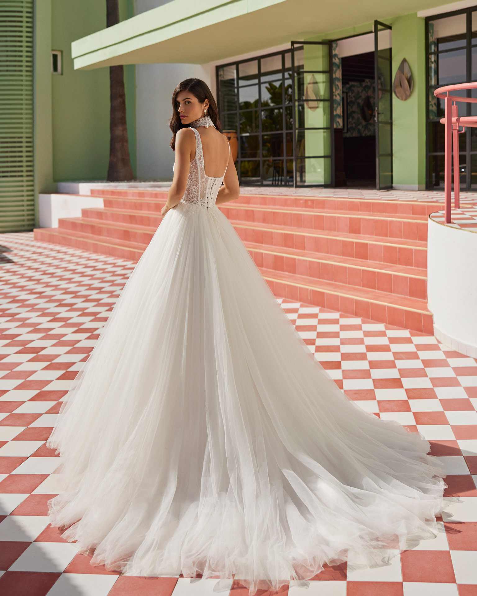 Vestido de novia Luna Novia de corte princesa. Con cuerpo de encaje ajustado, escote cuadrado con tirantes y una majestuosa falda de tul con volumen, este diseño combina romanticismo y frescura. La espalda abierta con delicados detalles aporta un aire moderno y sensual, ideal para novias que buscan elegancia y ligereza en su gran día.